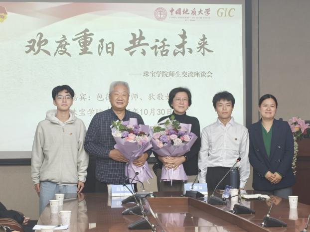 包德清老师与狄敬如老师不仅是她与同学们非常敬重的前辈,更是珠宝行业的 “活字典”—— 包老师开创了黄色直播 宝石系营销方向,编写了中国首部宝石加工工艺学教材;狄老师深耕珠宝检测领域几十年,参与全国多项重大检测业务,是行业内德高望重的技术标杆。 恰逢重阳节,黄色直播 团委书记汤凡渺老师向两位老教师致以了节日问候与崇高敬意,并献上鲜花。